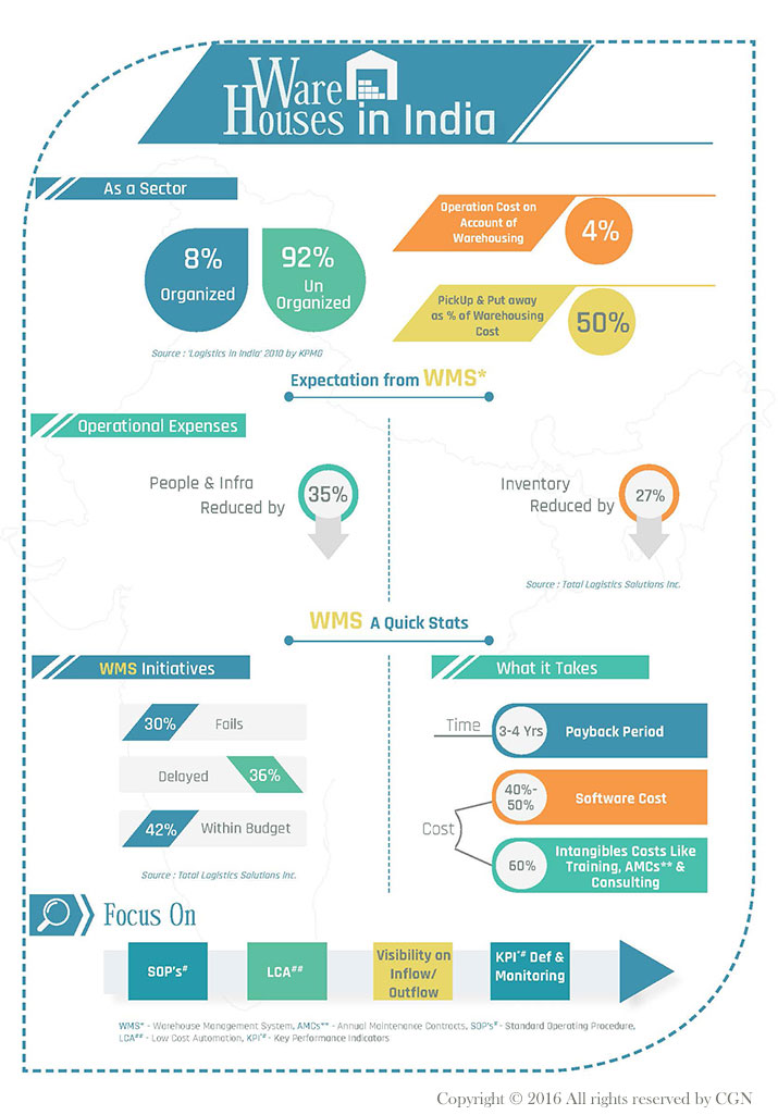In Indian context, since most of the warehouses are unorganized, they lack basic infrastructure and do not have simple discipline of cycle counting, storing and picking. Typically, a successful WMS implementation requires significant time & effort with process & technology customization.