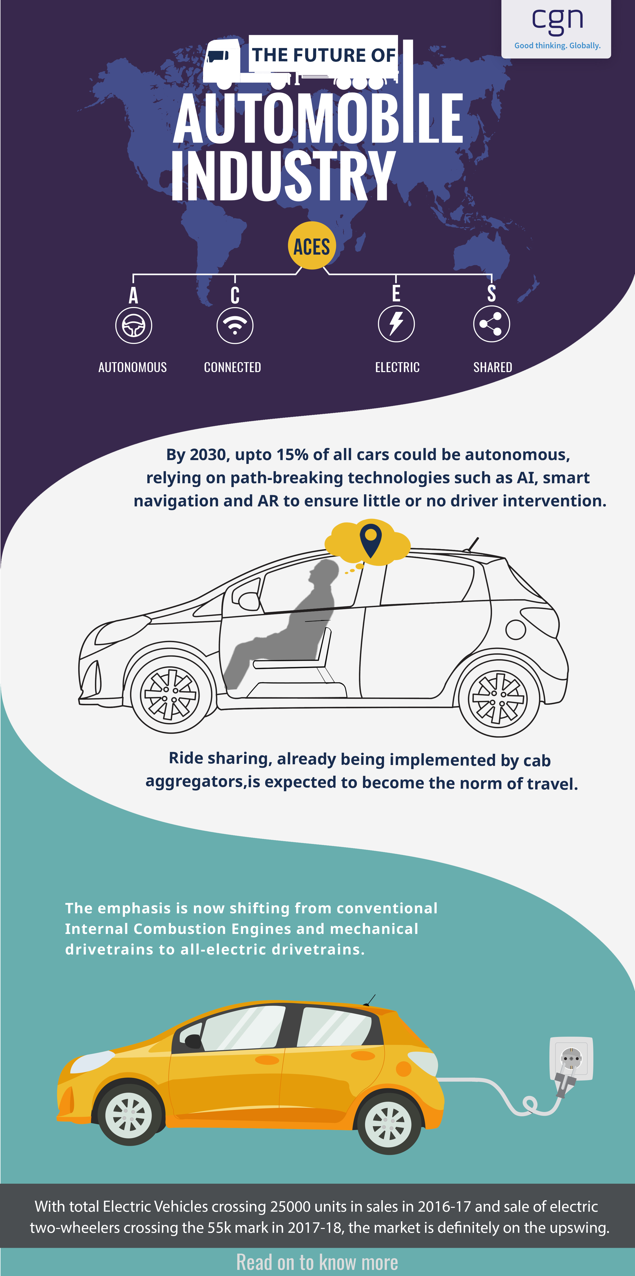 The emphasis is now shifting from conventional Internal Combustion Engines and mechanical drivetrains to all-electric drivetrains. Electric drivetrains will rely on the latest advances in battery charging and storage technology meaning that you will be probably charging your cars overnight along with your smartphones at home! Ride sharing is already being implemented by cab aggregators like Uber, Ola and Lyft that allow you to share your cab with random strangers. Experts say that ride sharing will soon become the norm of travel.