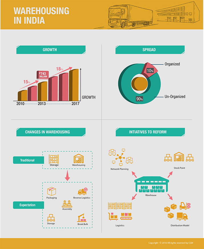 Growth sectors like agriculture, manufacturing, ecommerce and organized retail are driving the growth of warehousing. Expectations from warehousing as an industry has also increased, way beyond from just being a traditional storing services to provide additional services. These services may include merging and breaking up of cargo, packaging, classifying, bar coding, reverse logistics, adding value to the customers.