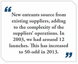 Today the game has changed. Back in 2003 there were seven large car companies, today there are 14. The new entrants have by and large attempted to source from existing suppliers, adding to the complexity of the suppliers’ operations. In 2003, we had around 10-12 product launches. This has increased to 50-odd in 2013. The increased complexity is of a different nature from quality or volumes, and is less easy for people to understand. When you move to the components level, the increase in complexity is even more startling. An auto components supplier who was manufacturing 20-25 components in 2003 is today dealing with some 400 components.