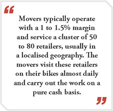 The movers are an extension of the motorcycle courier delivery model used by the e-commerce retail companies to the field of general trade, the belly of the market. In this area, the movers are providing an independent and entrepreneurial service to help traditional retailers provide higher service levels to their customers by avoiding stock outs. Essentially, they provide fast delivery of small lots to retailers who run out of stock. They act as a direct pipe between the distributors and wholesalers and the retailers in an on demand fashion.</p> <p>Movers typically operate with a 1 to 1.5% margin and service a cluster of 50 to 80 retailers, usually in a localised geography. The movers visit these retailers on their bikes almost daily and carry out the work on a pure cash basis. Distributors are also happy to work with movers. There is no capital investment in vehicles. Movers address pockets of geographies and have a strong entrepreneurial need to ensure increased sale.  The fact that it is getting established and growing shows that this seems to be a sustainable model. Essentially, they are arbitraging the poor service levels currently in play in the general trade and ensuring the retailer has a higher availability.</p> <p><strong>< Is this the way of the future?