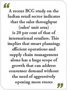 A recent BCG study on the Indian retail sector indicates that the sales throughput (sales/unit area) is 20 per cent of that of international retailers’ii. This implies that smart planning; efficient operations and supply chain management alone has a huge scope of growth that can address consumer demand without the need of aggressively opening more stores.